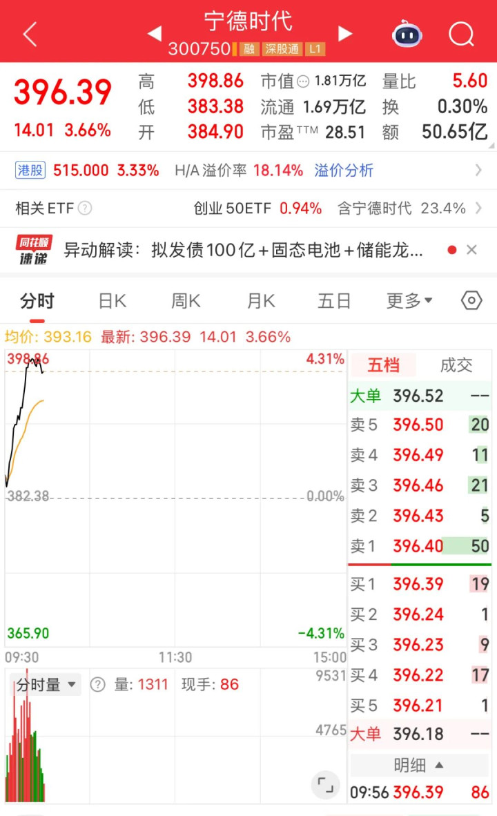 个股方面,早盘宁德时代股价冲高,截至发稿涨3.66%,报396.39元/股。