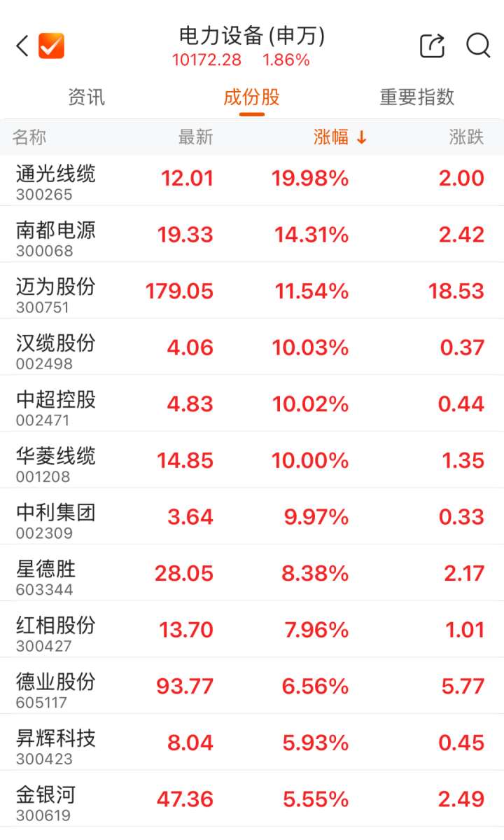 此外,电力设备概念冲高。截至发稿,汉缆股份、中利集团等多股涨停。